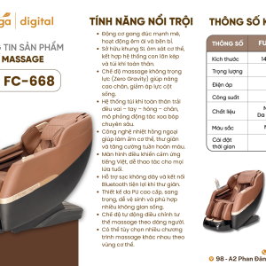 Ghế massage cao cấp FC668 được sản xuất và phân phối chính hãng bởi Fujiwaga. Thương hiệu được đông đảo người dùng ưa chuộng với các sản phẩm ghế massage chăm sóc sức khỏe người dùng.