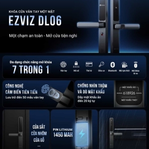 Ezviz CS-DL06 là mẫu khóa cửa thông minh thế hệ mới, được nghiên cứu và sản xuất bởi thương hiệu Ezviz – một trong những công ty hàng đầu thế giới về thiết bị an ninh và IoT. Điểm nổi bật của DL06 là đa dạng phương thức mở khóa: vân tay, mật mã, thẻ từ, chìa khóa cơ và mở khóa từ xa qua smartphone.