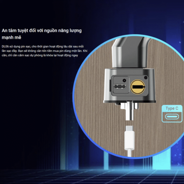 Khóa sử dụng pin sạc lithium qua cổng Type-C, mỗi lần sạc đầy có thể dùng trong nhiều tháng. Ngoài ra, trong trường hợp khẩn cấp, bạn có thể sử dụng pin dự phòng để cấp nguồn tạm thời.