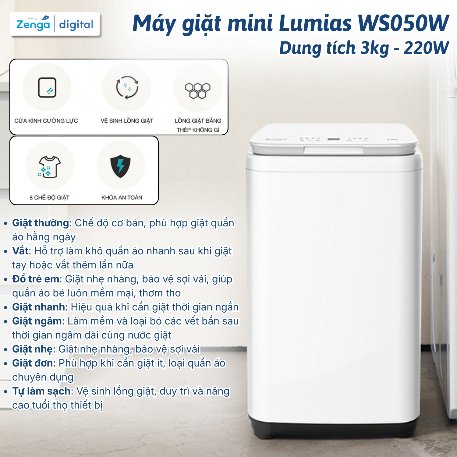 Máy giặt mini Lumias WS050W – 3kg, 220W – 8 chương trình giặt – Chính Hãng
