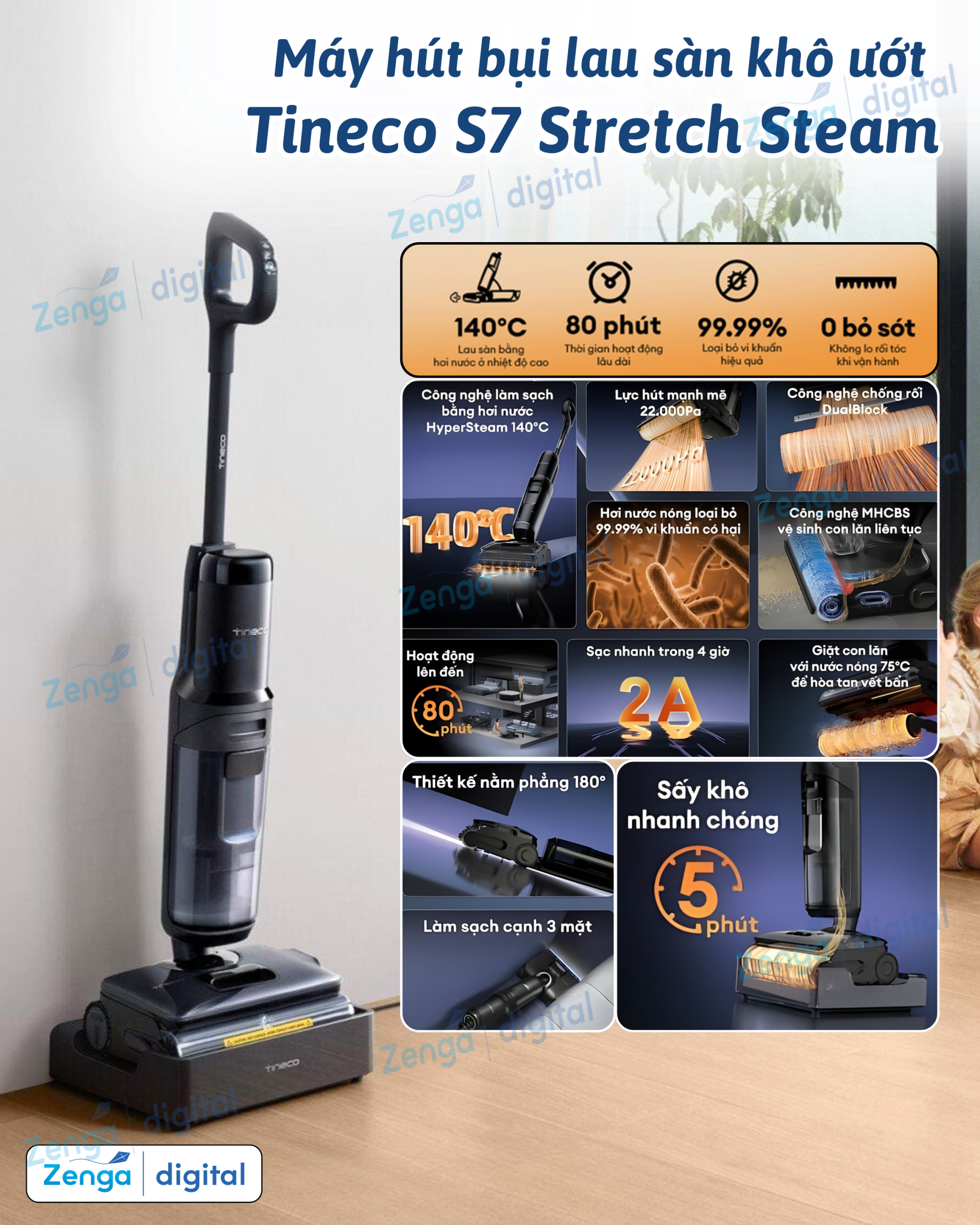 Tineco FLOOR ONE S7 Stretch Steam đã tạo nên một “cú nổ vang dội” khi đây là máy lau nhà đầu tiên sở hữu công nghệ làm sạch bằng hơi nước 140 độ, đánh bay mọi vết bẩn cứng đầu, đem lại hiệu quả làm sạch tối ưu nhất. Đầu tiên, máy hút bụi lau sàn khô ướt Tineco FLOOR ONE S7 Stretch Steam sở hữu thiết kế “tuyệt đối điện ảnh: khi sở hữu một màu đen sang trọng, cùng những đường cong tinh tế, giúp không gian nhà của bạn trở nên hiện đại hơn. Bên cạnh đó, nhờ có công nghệ HyperSteam 140 độ, Tineco FLOOR ONE S7 Stretch Steam có khả năng diệt khuẩn mạnh mẽ, loại bỏ hoàn toàn vi khuẩn và vết bẩn cứng đầu, mang lại không gian sống sạch sẽ và đảm bảo an toàn cho cả gia đình bạn.