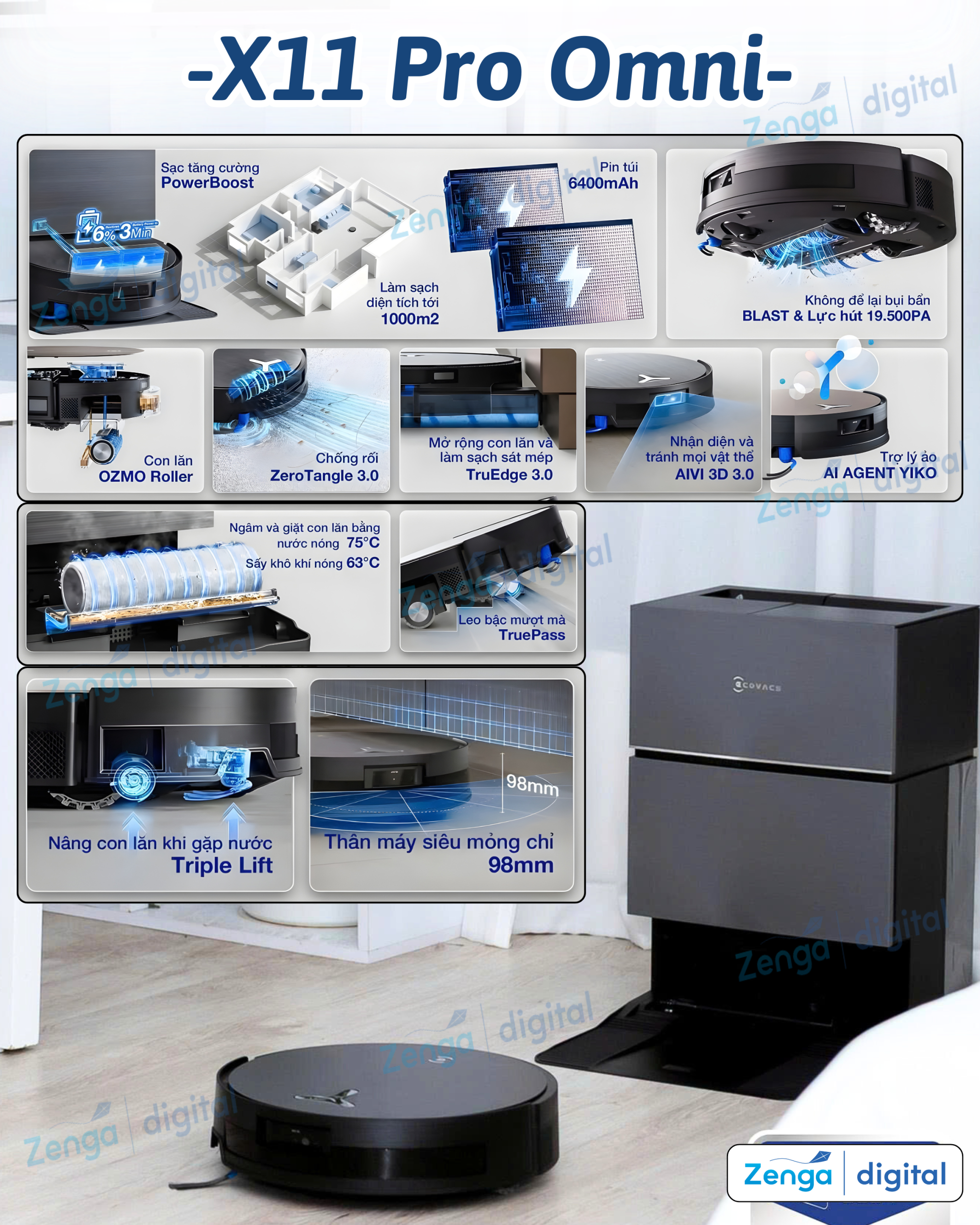 Nền tảng của một ngôi nhà sạch bóng đến từ khả năng làm sạch vượt trội. Ecovacs X11 Pro Omni định nghĩa lại tiêu chuẩn này với một loạt công nghệ độc quyền.